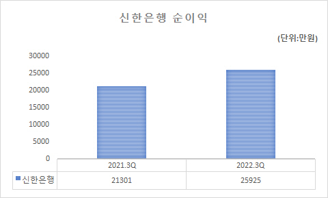 21일 신한은행에 따르면 올 3분기 순이익은 9094억원으로 전분기 대비 10.9% 증가했다. 누적 순이익은 2조5925억원으로 지난해 같은 기간과 비교해 21.7% 늘었다. 이는 사상최대 실적으로, 지난해 연간순이익(2조4944억원)을 뛰어넘은 수준이다.