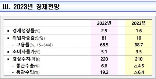21일 정부가 발표한 2023년 경제정책방향에 따르면 정부는 내년 우리 경제 성장률 전망치를 기존 2.5%에서 0.9%포인트 내린 1.6%로 제시했다.