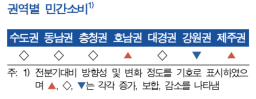 소비현황을 보면 민간소비는 억눌렸던 수요가 급격히 살아나는 펜트업 모멘텀이 약화되면서 전분기 수준을 유지했다. 호남권과 제주권을 중심으로 민간소비가 살아난 반면 강원권은 감소했다.