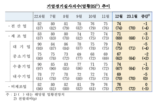 한국은행이 28일 발표한 '12월 기업경기실사지수(BSI) 조사 결과'에 따르면 모든 산업의 업황 BSI는 74로 전월(75)대비 1포인트(p) 하락했다. 지난 2020년 10월(74) 이후 2년 2개월 만에 가장 낮은 수준이다.
