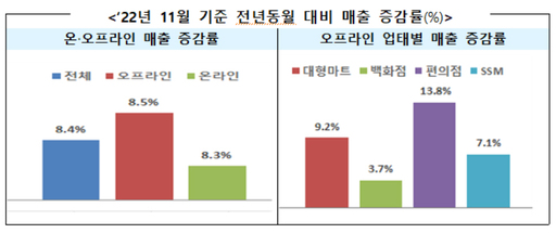29일 산업통상자원부에 따르면, 11월 주요 유통업체 총 매출은 14조8000억원으로 1년 전(13.6조원) 대비 8.4% 상승했다. 오프라인(8.5%)과 온라인(8.3%) 모두 성장세를 기록했다.
