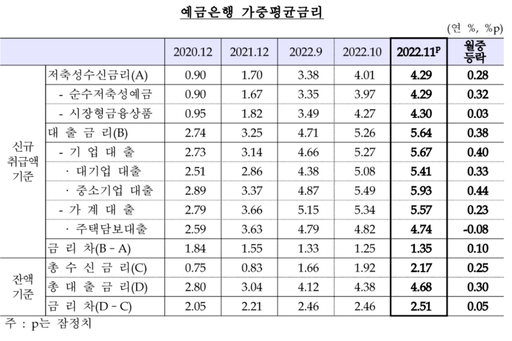 한국은행이 30일 발표한 '2022년 11월 금융기관 가중평균금리'에 따르면 예금은행의 신규취급액 기준 전체 대출금리는 연 5.64%로 전월대비 0.38%포인트(p) 상승했다. 2012년 5월(5.66%)이후 10년 반만에 가장 높은 수준이다.