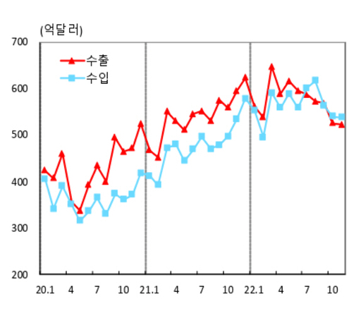 지난해 11월 경상수지가 6억2000만달러 적자를 기록했다. 반도체, 선박, 화공품 등을 중심으로 수출이 부진했기 때문이다.