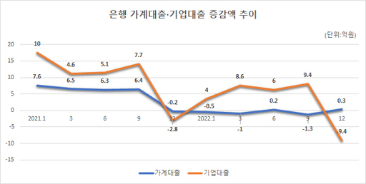 대기업대출은 재무비율관리를 위한 일시상환 등으로 6조1000억원 감소했다. 중소기업대출은 코로나19 금융지원 규모가 축소하면서 3조3000억원 줄고, 개인사업자대출도 8000억원 감소했다.