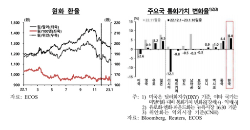 미국 연방준비제도(Fed)의 금리인상 속도조절에 대한 기대감이 커지면서 지난달 원·달러 환율이 하락했다. 반면 고금리 여파로 경기둔화 리스크에 대한 경계감이 커지면서 외국인의 국내 증권투자자금은 순유출로 전환했다.