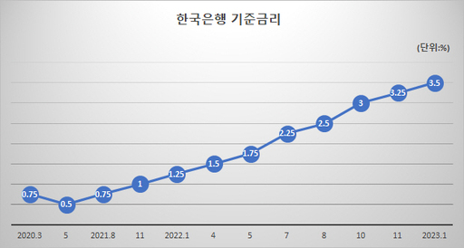 한국은행 금융통화위원회는 13일 오전 회의를 열고 기준금리를 0.25%포인트(p) 높인 연 3.5%로 결정했다. 지난해 4월 이후 7차례 연속 인상 결정이다.