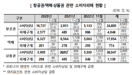 대표적인 소비자피해 사례는 ▲항공권의 경우 취소 시 과도한 위약금 부과, 항공편 지연·결항 등 계약불이행, ▲택배는 물품 파손·훼손, 분실, ▲상품권은 유효기간 경과로 인한 사용 거부나 잔액 환급거부 등이 꼽힌다.