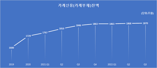 지난해 3분기 말 우리나라의 가계신용(가계부채) 총액은 1871조원으로, 이 중 주택담보대출은 1008조원(54%), 신용대출을 포함한 기타대출은 749조원(40%), 판매신용은 114조원(6%)이다. 지난해 12월말 가구수는 2370만세대로 부채를 보유한 가구비율(63.8%)을 적용하면 한 가구당 가계부채는 1억2374만원이다.