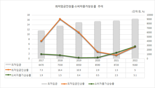 같은 기간 소비자물가 상승률은 7.7%가량 오른 것으로 집계됐다. 2년간 물가가 7% 넘게 오르면서 실질 최저임금 상승률은 오히려 마이너스가 된 것이다.