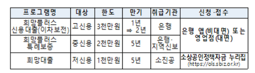현재 금융위원회는 소상공인을 대상으로 '희망대출플러스'를 운영하고 있다. 방역지원금 또는 손실보전금을 받은 업체를 대상으로 신용도에 따라 최대 3000만원 한도로 저리 자금을 지원한다. 희망대출플러스 지원기간은 오는 25일부터 1년에서 2년으로 연장한다.