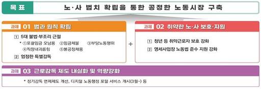 고용부는 5대 불법과 부조리 행위로 포괄임금 오남용과 임금체불, 부당노동행위, 직장내 괴롭힘, 불공정 채용으로 정했다. 포괄임금 오남용은 올해 처음 기획감독을 실시하고 있다. 오는 3월까지 소프트웨어 개발업 등 사업장이 대상이다. 올 하반기에도 기획감독을 이어간다.