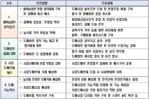 농림축산식품부는 17일 출하 농업인의 권익증진과 농산물 도매시장의 공공성 강화를 위한 농산물 도매시장 유통구조 개선을 추진한다고 밝혔다.