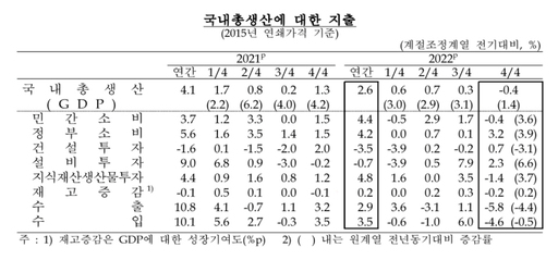 지난해 4분기 GDP 성장률은 -0.4%로 집계됐다. 중국의 코로나 재확산과 반도체 경기 하락등이 겹치며 수출, 민간소비 등이 감소한 영향이다.
