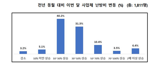 올해 1월 기준으로 전년 동월과 비교한 난방비 변동 정도에 대해선 '10~30% 상승'이 40.2%, '30~50% 상승'이 31.3%로 전체의 71.5%가 10~50% 상승한 것으로 집계됐다. 2배 이상 올랐다는 곳도 6.4%에 달했다. '감소했다'고 답한 3.2%를 제외하면 응답자의 96.8%가 난방비가 올랐다.