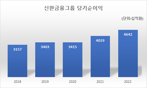 신한금융그룹이 지난해 4조6423억원의 당기순이익을 달성하며 역대 최대 실적을 기록했다. 1년 전과 비교해 15.5% 증가한 수준이다. 이에 따라 3년 만에 KB금융을 제치고 순이익 1위를 차지했다. 대내외의 불확실한 경기상황으로 유가증권의 손익이 감소하며 비이자이익이 줄었지만 금리상승으로 은행·카드사의 이자이익이 증가해 당기순이익 증가를 이끌었다.