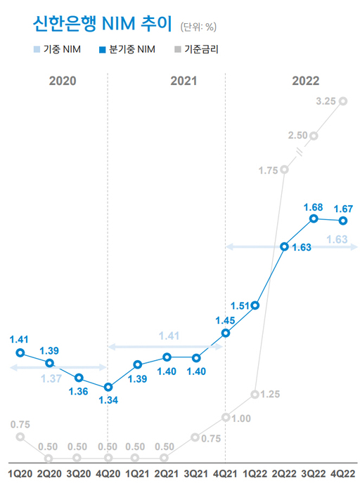 신한금융의 연간 이자이익은 10조6757억원으로 전년 동기 대비 17.9% 늘었다. 그룹의 순이자마진(NIM)은 1.96%로 1년전(1.81%)과 비교해 0.15%p 올랐다. 은행도 같은 기간 1.41%에서 1.63%로 0.22%p 증가했다.