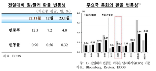 원·달러 환율은 지난달 2일 1272.6원에서 2월 2일 1220.3원으로 하락한뒤 지난 7일 1255.3원으로 나타났다. 변동폭은 지난해 12월 7.2원에서 1월 4원으로 줄었다. 변동률도 같은기간 0.56%에서 0.32%로 감소했다.