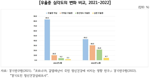 경기연구원은 2022년 11월 24일~12월 1일 경기도민 1천3명을 대상으로 한 설문조사 결과를 담은 '위기상황에서의 취약계층 정신건강 실태 및 정책적 대응 방안' 보고서를 발간했다고 9일 밝혔다.
