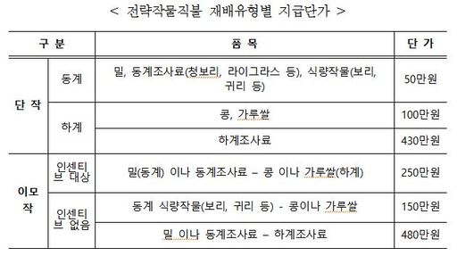 겨울에 식량작물이나 조사료를 재배하면 ㏊당 50만 원, 여름에 논콩·가루쌀을 재배하면 100만 원, 조사료 재배 시 430만 원을 지급한다. 동계 밀이나 조사료를 재배하고 하계작물로 논콩이나 가루쌀을 이모작하면 100만 원의 인센티브를 추가로 받을 수 있다.