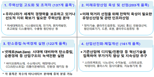 정책금융지원협의회 지원분야도 신성장분야를 반영해 ▲주력산업 초격차 ▲미래유망산업육성 ▲탄소중립·녹색경제 실현 ▲산업선진화·체질개선 등의 4대 이니셔티브에 따라 재분류한다.