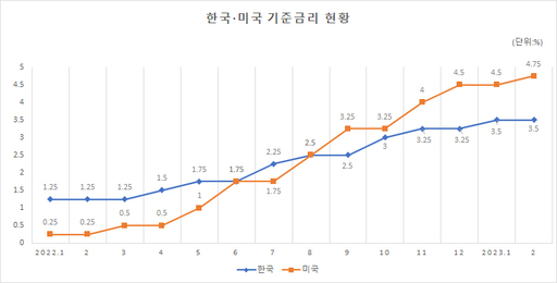 현재 미국과의 금리격차는 1.25%p 벌어진 상태다. 미국 연준이 3월 기준금리를 최소 0.25%p 인상하더라도 금리격차는 1.50%p까지 벌어진다. 미국과의 금리격차가 벌어지면 강 달러 현상이 이어져 외국인 자금이 유출될 가능성이 커진다. 또 수입물가가 오르면서 물가상승에도 영향을 미칠 수 있다.
