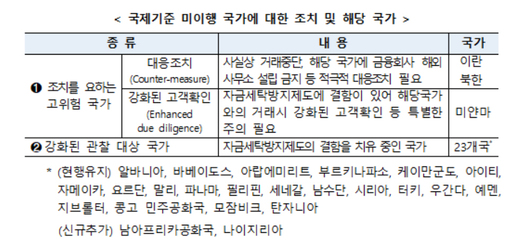 FATF는 또 자금세탁 고위험국가(대응조치)에 북한과 이란을 포함하고, 미얀마도 고위험국가(강화된 고객확인)에 포함키로 했다. 고위험국가(대응조치)는 해당 국가에 금융회사 해외사무소 설립이 금지되는 등 적극적 대응조치가 적용된다. 고위험국가(강화된 고객확인)은 해당국가와의 거래시 강화된 고객확인 등이 필요하다.