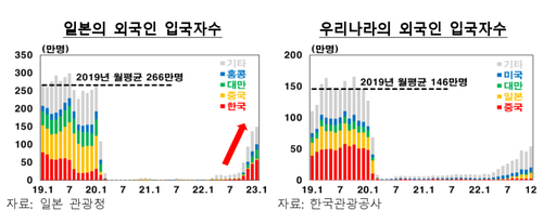 지난달 일본을 방문하는 외국인 입국자수가 150만명에 달하는 것으로 집계됐다. 팬데믹 이전 외국인 입국자수의 56% 수준이다. 반면 우리나라의 외국인 입국자수는 같은기간 37% 수준에 그쳤다. 경상수지를 구성하는 여행수지가 적자로 이어지며, 개선이 어려워 질 수 있다는 전망이 나온다.