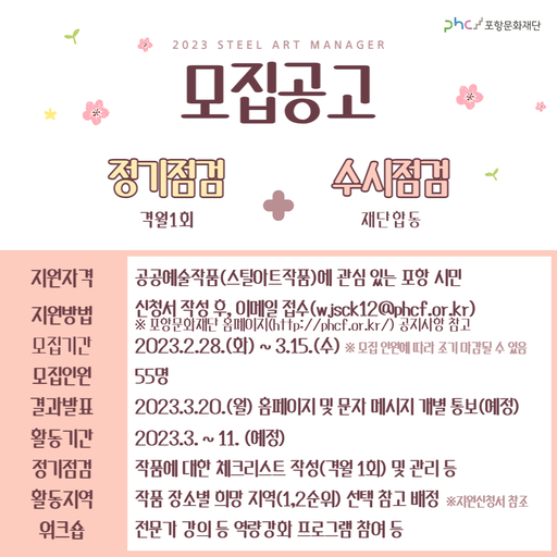 신청은 포항문화재단 홈페이지에서 지원서를 내려받은 후 이메일과 구글폼 신청서를 통해 하면 되고, 결과는 3월 20일 홈페이지 게재 및 문자 메시지를 통해 개별 통보될 예정이다.