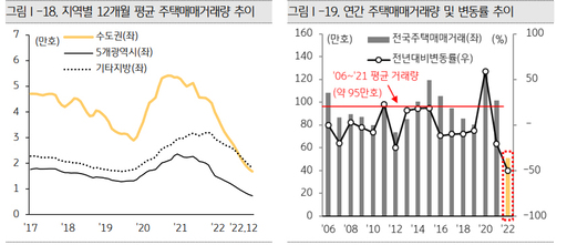 주택 매매거래량은 지난 2020년 역대최대치인 128만호를 기록한 이후, 2022년 약 51만호로 급감했다. 금리인상과 대출규제가 강화되며 수요가 감소한 영향이다. 주택회전율도 2020년 7%에서 2022년 2.7%로 떨어졌다.