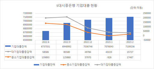 기업대출 중 대기업대출 잔액은 111조558억원으로 지난해 말(105조4609억원)과 비교해 5.3% 증가했다. 1월 대기업대출은 전달보다 4조223억원, 2월 1조5726억원 늘었다.