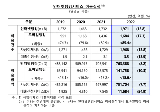 모바일뱅킹 이용건수 중 인터넷전문은행 이용건수는 2019년 16.8%에서 2022년 25.7%증가했고, 이용금액도 같은기간 10.7%에서 25.6%로 늘었다.