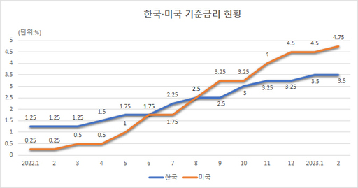 다만 예상보다 길어진 미국의 통화정책은 변수로 작용한다. 현재 미국의 기준금리는 4.50~4.75%로 우리나라의 금리보다 1.25%p 높다. 연준이 이달 FOMC에서 기준금리를 0.5%p 인상하면 한미금리차는 1.75%까지 벌어진다. 한미금리차가 1.75%p까지 벌어진 적은 지난 2014년 10월 이후 8년 4개월 만이다.