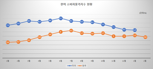 통계청에 따르면 소비자물가지수(CPI)는 110.38로 1년전과 비교해 4.8% 상승했다. 지난해 6월 6%까지 오른 소비자물가상승률은 9월 5.6%, 12월 5%대에 머무르다 1월 4%대에 진입했다. 이 총재는 "3월 이후 물가가 4.5% 이하로 내려가고, 연말에는 3% 초반이 될 것"이라고 했다. 기준금리 인상의 효과가 물가에 반영되고 있다는 분석이다.