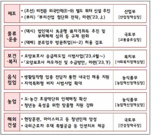 이에 정부는 제조업(산업부)과 물류·운송(국토교통부), 보건·복지(보건복지부), 음식점업과 농업(각각 농림축산식품부), 해외건설(국토부) 등 6대 업종 빈 일자리 해소 대책을 내놨다. 업종별로 구인난 원인과 산업별 특성에 맞춰 일자리 질 개선, 수요-공급 매칭 등 다방면으로 지원한다.