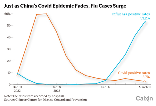 22일 차이신에 따르면 중국 질병통제예방센터(CDC)가 집계한 결과 전국 병원에서 보고된 독감 검사 양성 비율은 이달 둘째주 53.2%로 한 달 전 대비 70배 이상 급증했다. 같은 기간 전국 코로나19 양성 비율은 2.7%에 불과했다.