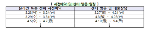 예컨대 오는 23일 온라인 또는 전화로 사전예약할 경우 3월 27일부터 4월 21일까지 방문예약 할 수 있다.