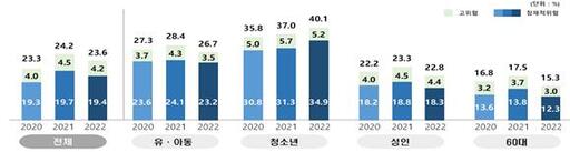 연령대별 과의존위험군 비율을 살펴보면, 유아동(만3~9세) 26.7%(-1.7%p)), 성인(만20세~59세) 22.8%(-0.5%p), 60대 15.3%(-2.2%p)로 청소년을 제외하고 모두 전년 대비 감소한 것으로 나타났다.