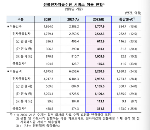 미리 선불금을 충전해 사용하는 선불전자지급서비스의 이용건수는 13.6% 증가한 2708만건으로 집계됐다. 이용금액은 8289억원으로 24.5% 늘었다. 간편결제·송금 이용실적이 꾸준이 증가한 영향이다.