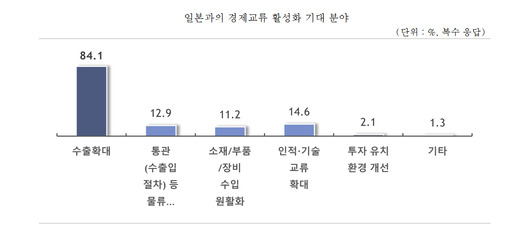 경제교류 활성화가 기대되는 분야로는 '수출확대'가 84.1%로 가장 많았다. 이외에 ▲인적·기술교류 확대(14.6%) ▲통관 등 물류 원활화(12.9%) ▲소재·부품·장비 수입 원활화(11.2%) 등도 뒤를 이었다.