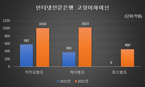 실제로 인터넷전문은행의 고정이하여신금액은 총 2493억원으로 전년(963억원) 대비 2배 이상 증가했다. 고정이하여신은 은행이 보유하고 있는 3개월 이상 연체된 대출로, 부실채권으로 분류된 여신을 말한다. 금리인상 여파로 장기 연체로 넘어가는 비중도 늘고 있다는 분석이다.