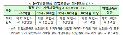 소비자 피해발생시 충분한 배상이 가능하도록 보험대리점보다 강화된 배상재원도 확보한다. 예컨대 직전반기 계약체결액이 10억원 미만인 플랫폼은 제휴 보험사 각 1000만원, 1000억원 이상은 제휴 보험사가 각 1억원씩 영업보증금을 예치하는 방식이다.