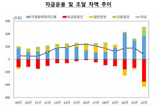 한편 일반기업으로 대변되는 비금융 법인기업의 순자금조달 규모는 175조8000억원으로 1년전(66조3000억원)과 비교해 109조5000억원 늘었다. 175조8000억원은 통계가 시작된 2009년 이후 가장 많은 순자금조달액이다. 지난해 원·달러 환율이 치솟으며 운전자금 수요가 필요하자, 사정이 어려운 기업을 중심으로 대출이 증가했다는 분석이다.
