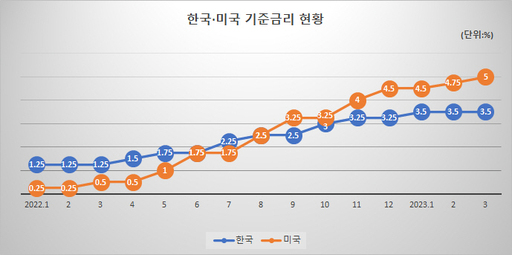 한국과 미국 간 기준금리 차이도 변수로 작용할 수 있다. 미국 기준금리는 4.75~5.00%로 한국 기준금리와의 차이는 1.5%포인트(p)다. 한은이 이번에 기준금리를 동결하고, 미국이 내달 초 금리를 0.25%p 올릴 경우 금리격차는 1.75%p까지 벌어진다.