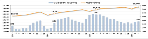 3월, 취업자를 뜻하는 고용보험 가입자 수는 1500만7000여명으로 지난해 같은 달(36만9000명)보다 2.5% 증가했다.