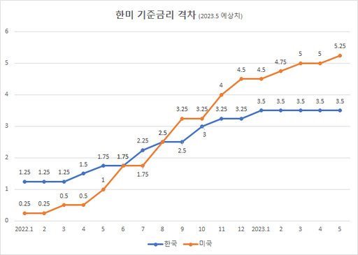 내달 FOMC에서 기준금리를 0.25%p 인상하면 한·미 금리차는 1.75%p로 역대 최대치로 벌어진다. 외국인 자금 유출이나 원화의 상대적 가치 하락(환율상승) 압력과 같은 후유증이 발생할 수 있다는 지적이다.