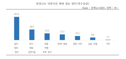 이런 가운데 중소기업들(중복응답)은 설치·정비·생산 업무(87.4%)를 연장근로 단위기간 확대가 가장 필요한 부문으로 꼽았다. 연구·개발·공학기술(39.7%), 미용·여행·숙박·음식(25.2%) 분야도 연장근로 단위기간 확대가 절실했다.