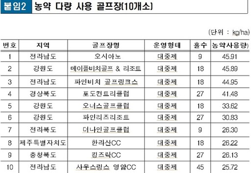 반대로, 단위면적당 농약 사용량이 가장 많은 골프장은 전남 오시아노, 강원 메이플비치골프앤리조트, 전남 파인비치골프링크스 등이었다.