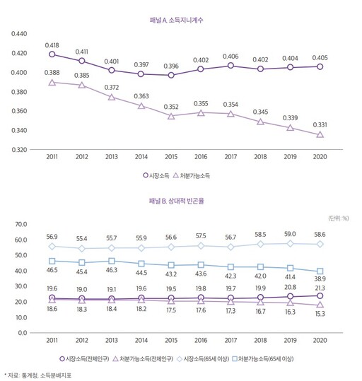 국민연금 제도 성숙에 따라 수급자가 증가하고, 기초연금 지출 대상·지급금액 확대 등 고령층에 대한 복지도 확대돼 특이 노인 인구의 처분가능소득 기준 상대적 빈곤율은 2011년 46.5%에서 2020년 38.9%로 7.6%포인트 내렸다.