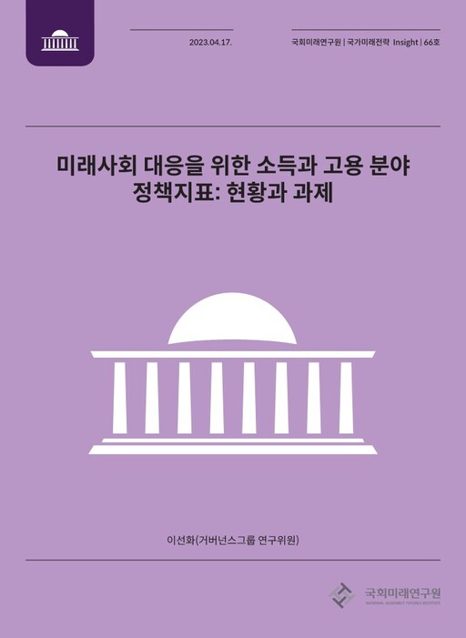 국회 미래연구원은 17일 발간한 '미래사회 대응을 위한 소득과 고용 분야 정책지표: 현황과 과제'에서 "소득·고용 분야 사회안전망 제도와 관련한 미래 의제 구성을 위해 현 제도의 핵심적 한계와 정책환경의 변화가 함께 고려돼야 한다"고 했다.