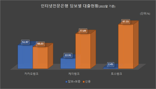 토스뱅크의 지난해 기준 담보·보증 규모는 2115억원으로 전체대출 금액의 2.45%다. 반면 신용대출(8조4279억원) 규모는 전체대출 금액의 97%에 달한다. 카카오뱅크의 경우 담보·보증 대츨 규모는 14조4925억원으로 52% 수준이다. 경기악화로 차주의 신용리스크가 악화될 경우 케이·토스뱅크를 중심으로 건전성이 악화될 수 있다는 것이다.